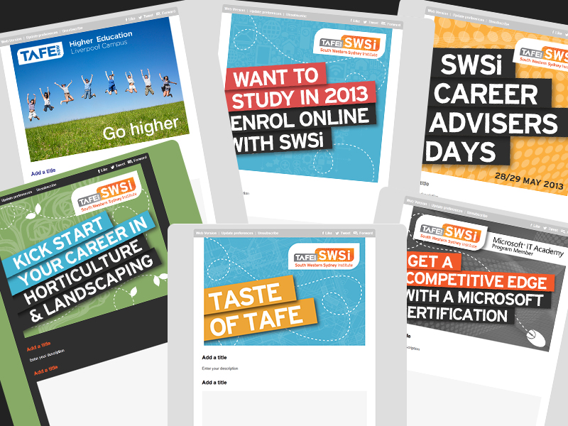 Enrolment eCampaigns ::: SWSi TAFE Campaign Monitor branding for enrolment eCampaign. Share this: Click to share on X (Opens in new window) X Click to share on Facebook (Opens in new window) Facebook Click to share on Pinterest (Opens in new window) Pinterest Click to share on LinkedIn (Opens in new window) LinkedIn Click to email a link to a friend (Opens in new window) Email Comments are closed.