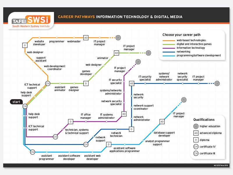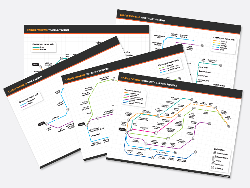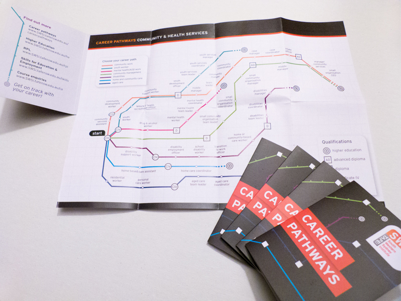 Designed, project managed and produced an innovative communication project responding to the NSW Government’s Smart and Skilled initiative. I developed a collection of fold-out Career Pathways brochures for each industry area focusing on the job outcomes of SWSi qualifications. I set up an advisory team to refine my design that emulates a railway network map, where students can choose their career path and identify job outcomes at different qualification levels. To accompany the printed brochures I also collaborated with our web developer to produce online interactive versions of each industry career map that links the job outcomes directly to our course information and online enrolment. I also provided links to downloadable interactive PDF alternatives of the graphics in case the users don’t have the required plug-in or browser version installed. This project has proven successful in creatively communicating and promoting the products that we offer to potential students both online and at careers markets for enrolments in 2013 and 2014.