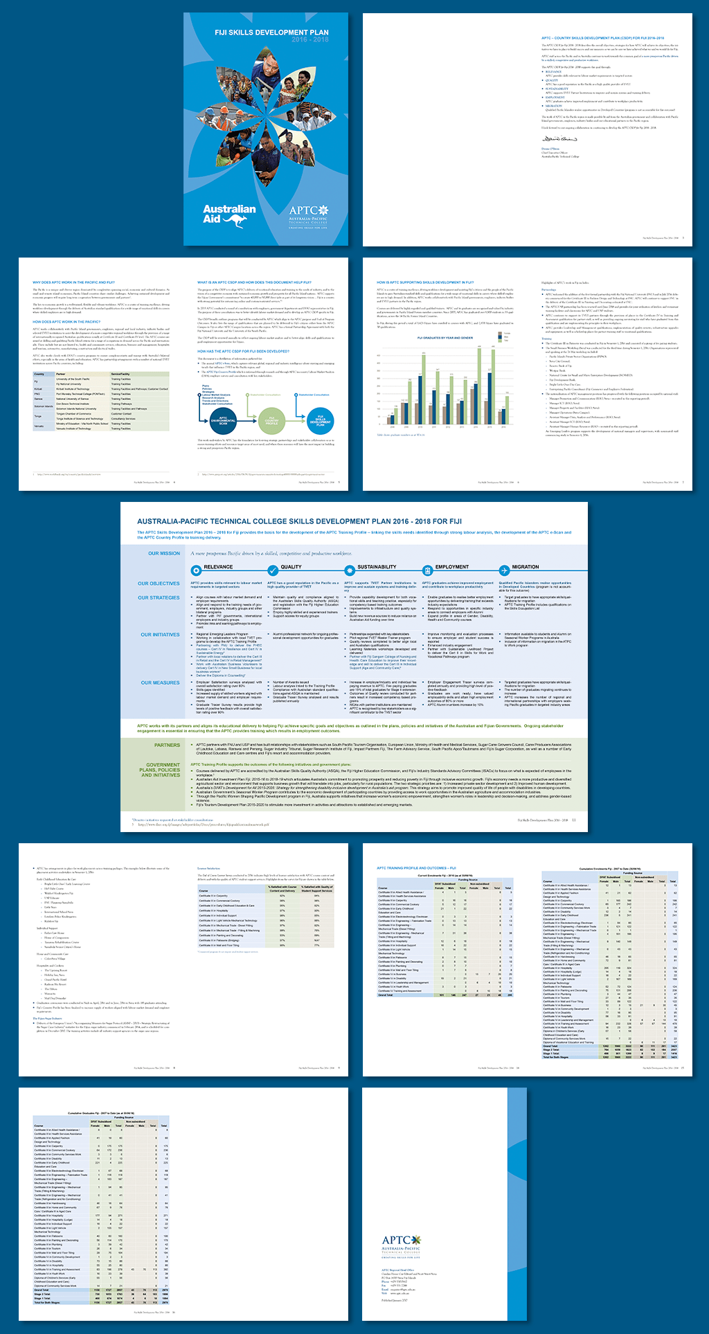 A collections of six Country Skills Development Plan reports for Australia-Pacific Technical College including individualised covers, text design, layout, graphics and an A3 fold-out development plan, all using organisational branding. Designed for both print and digital distribution.