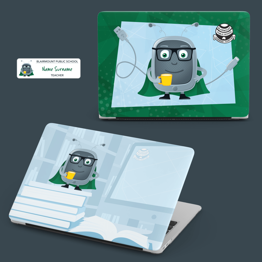Illustrated a teacher version of the WhyFi character for staff products including the new Staff Badge and Macbook Air Cover.