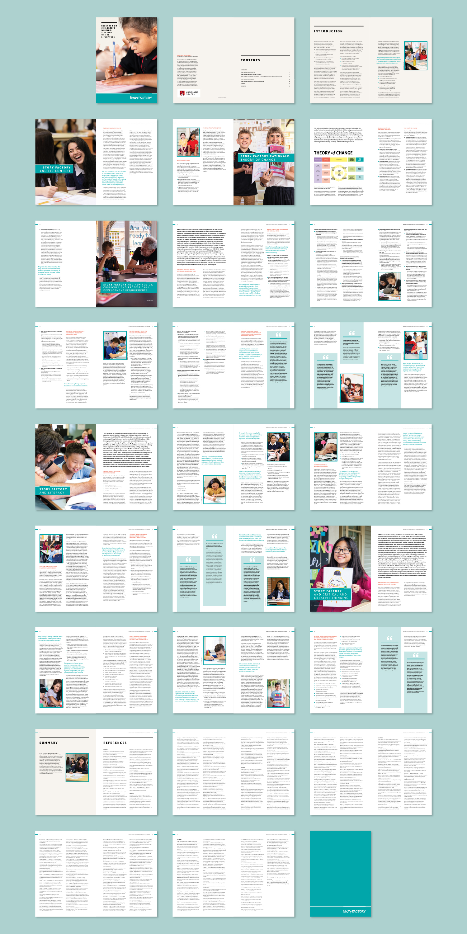 Designed a research report for Story Factory underpinning their work in the community, including cover and 50 page text layout. Exported for both print and digital distribution, the design was to remain simple and corporate, whilst still expressing the Story Factory brand.