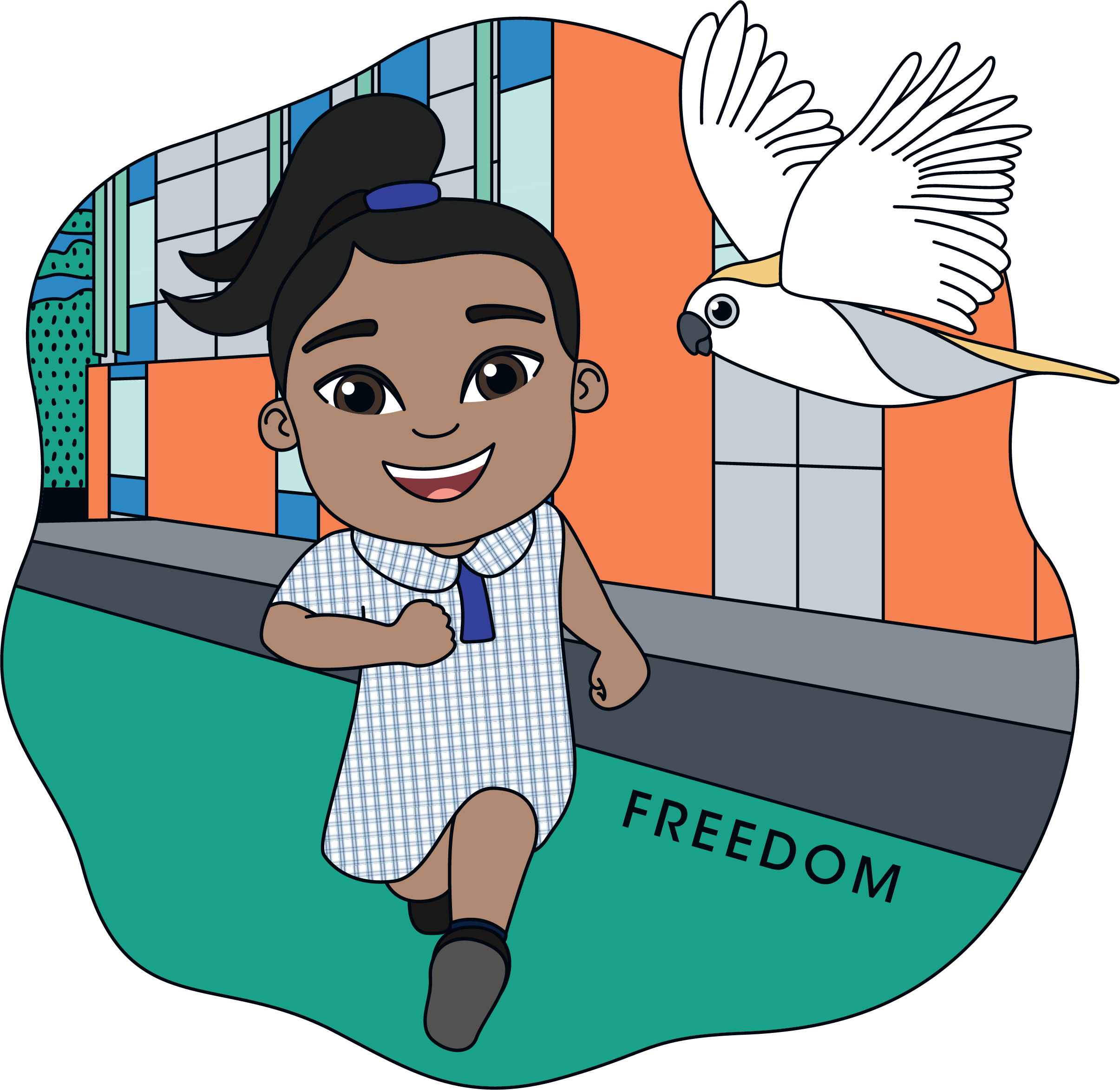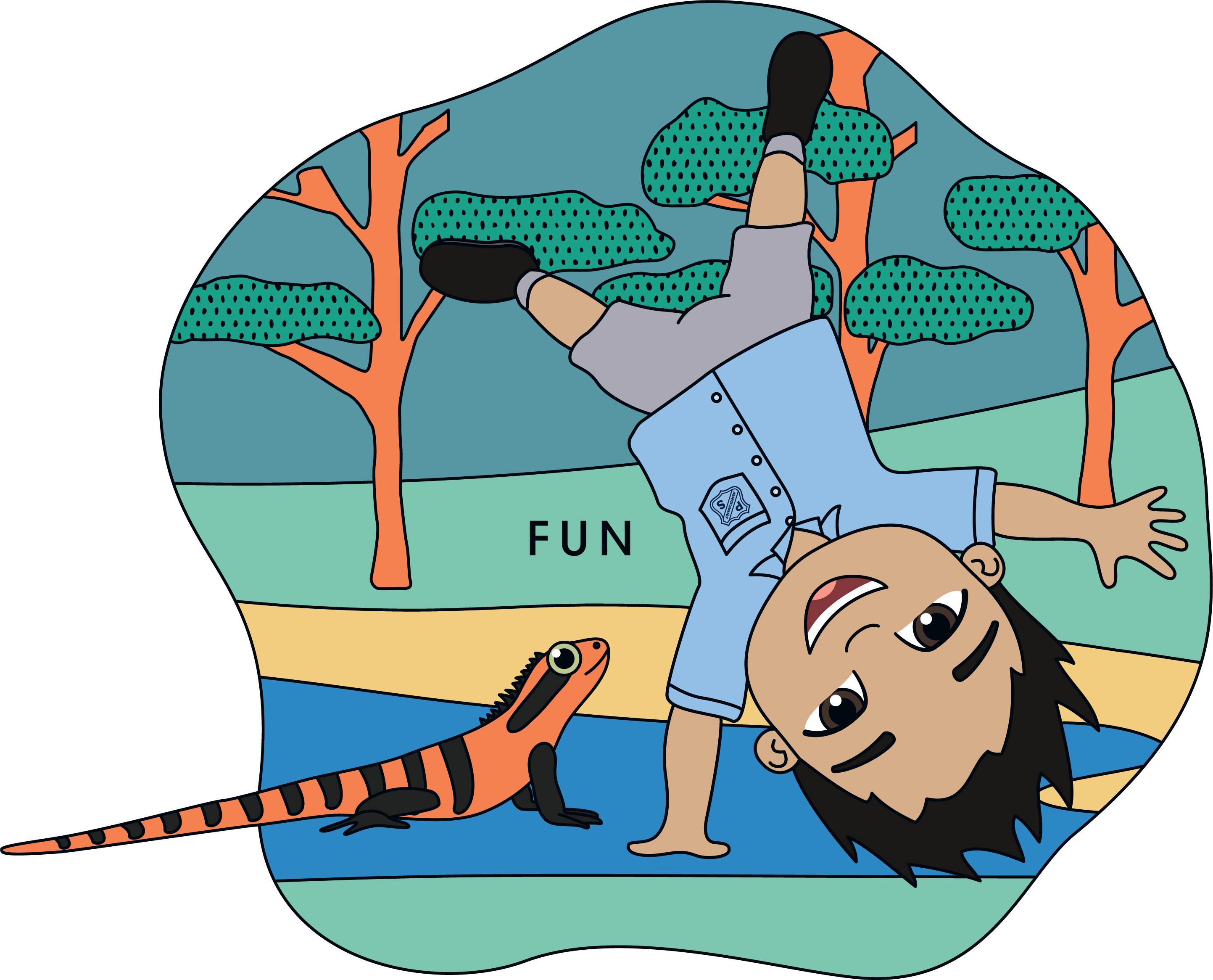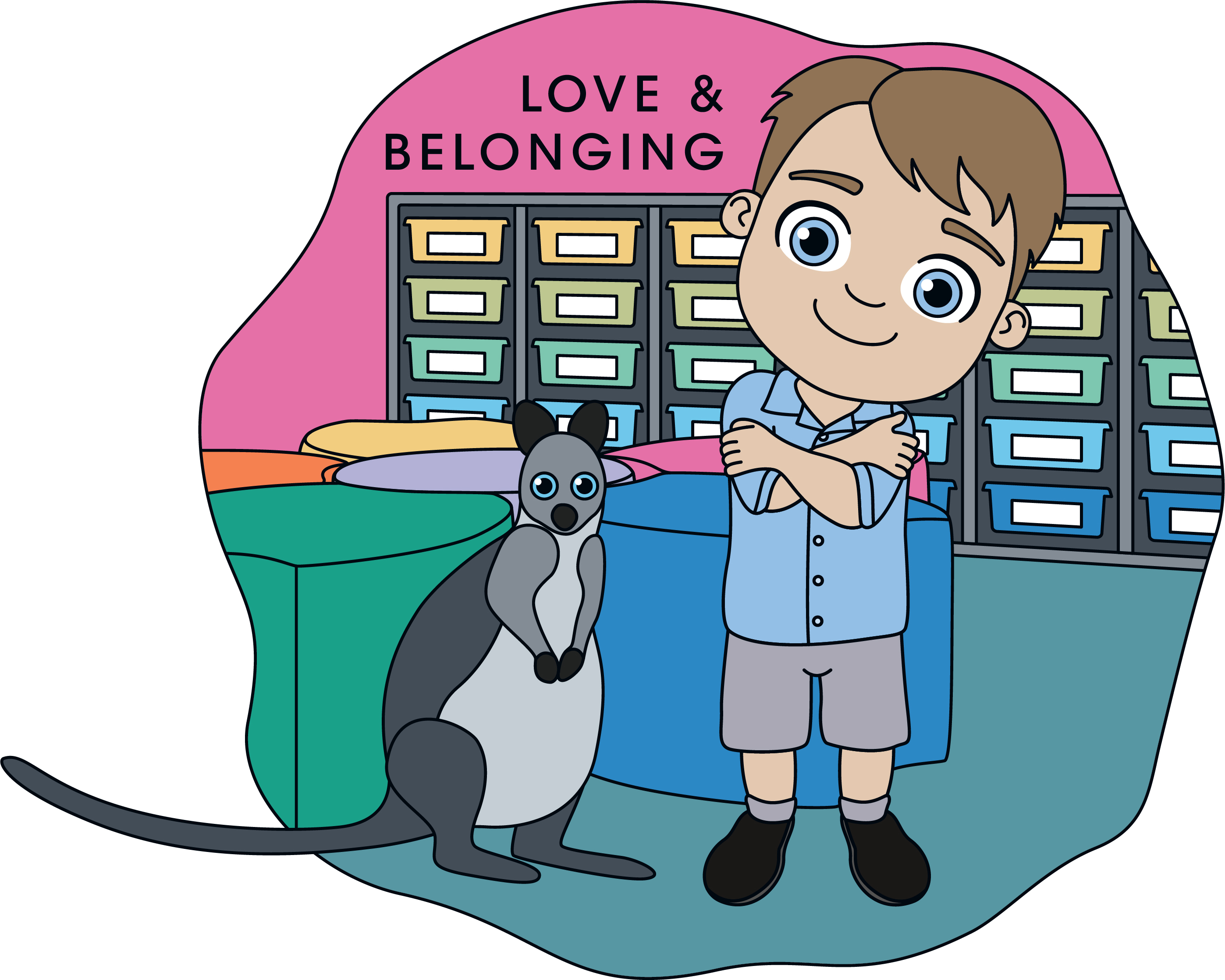 The characters reflect the cultural diversity at the school and sit within illustrated spaces of their school. The animals and plants included are native or indigenous to the area and reinforce the characteristics of the five basic needs.