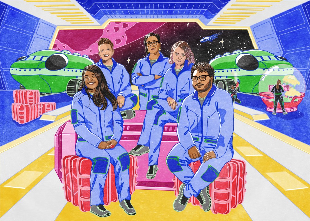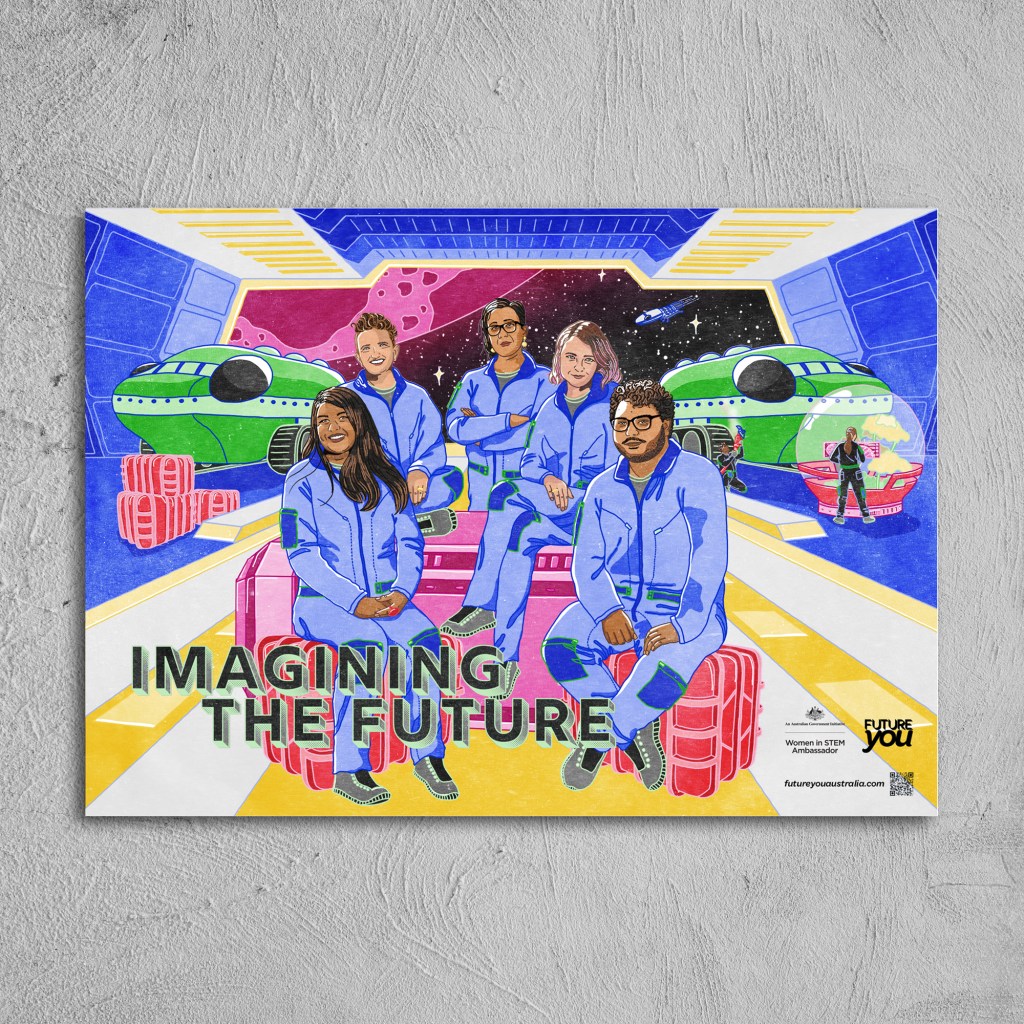 Imagining The Future is the new fiction strand of the Future You project and imagines our future…among the stars, with the help of five leading Australian writers. These five writer’s are illustrated here upon a space craft including Lili Wilkinson, Rebecca Lim, Gary Lonesborough, Melissa Keil and Alison Evans.