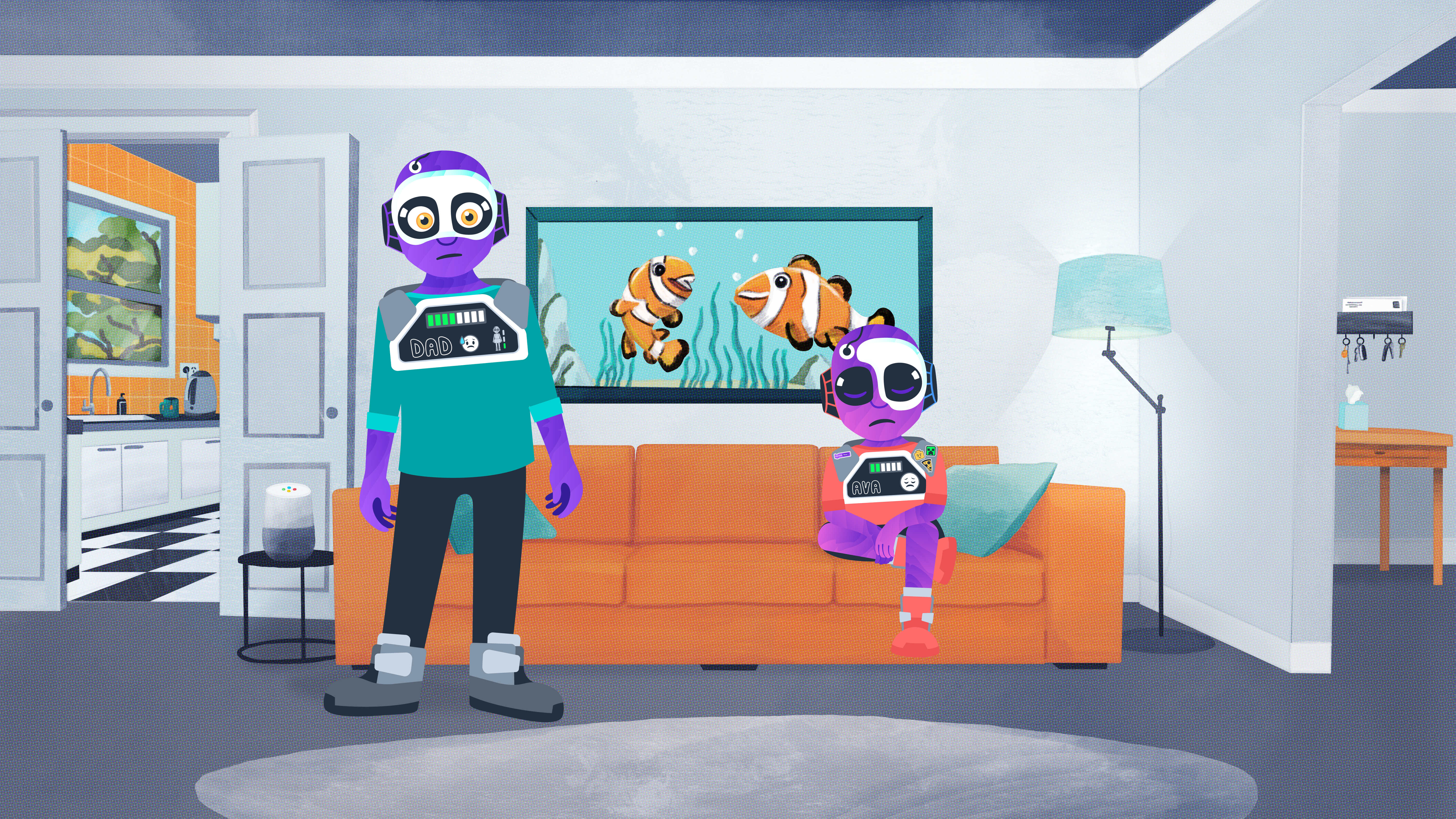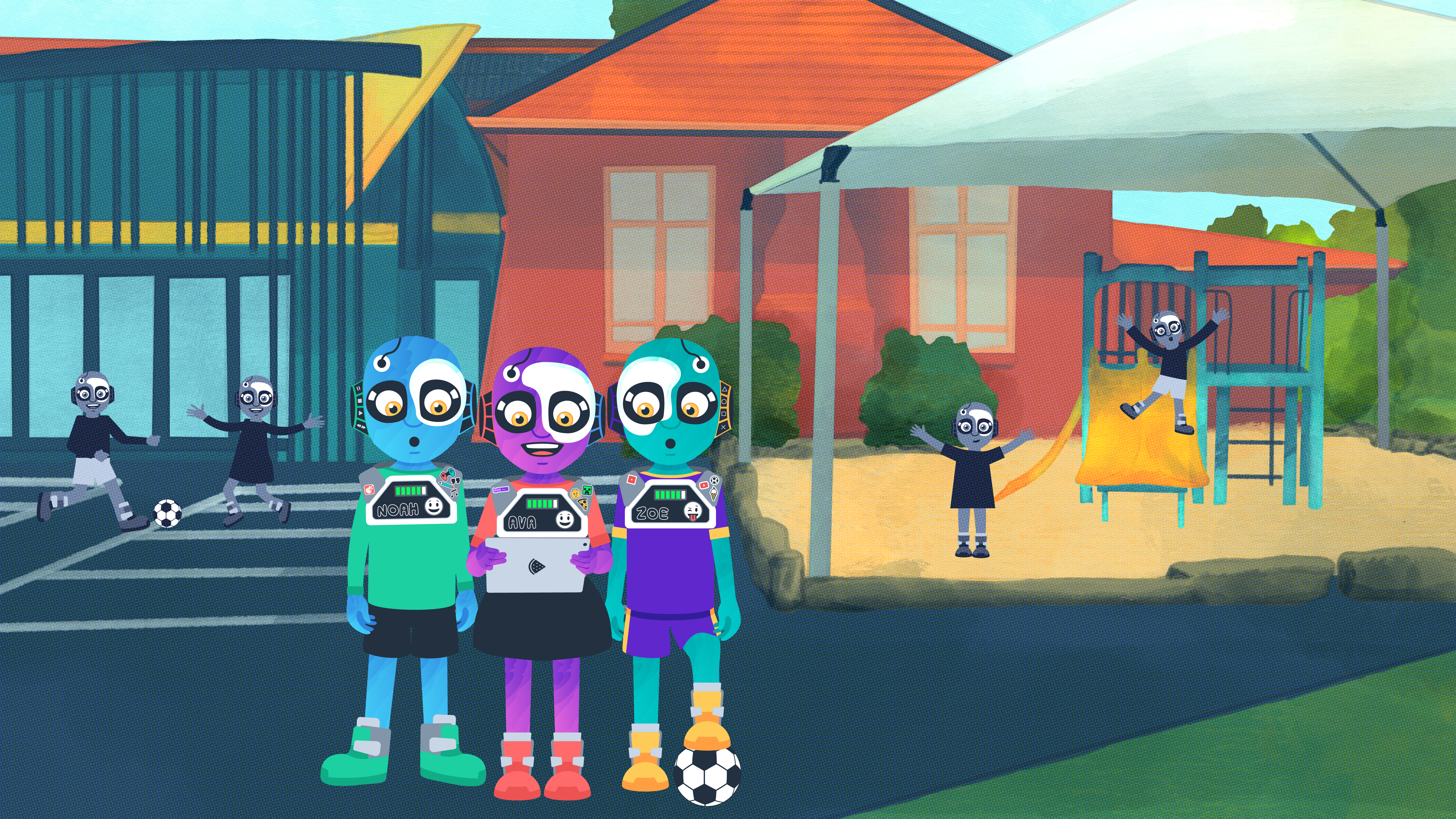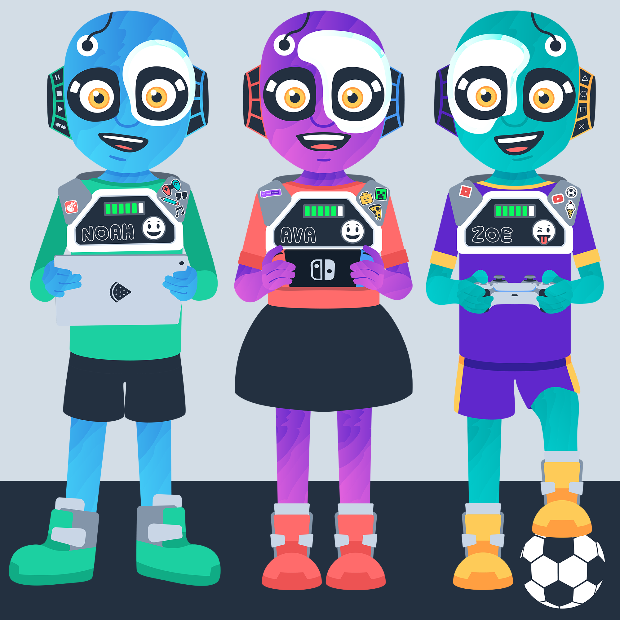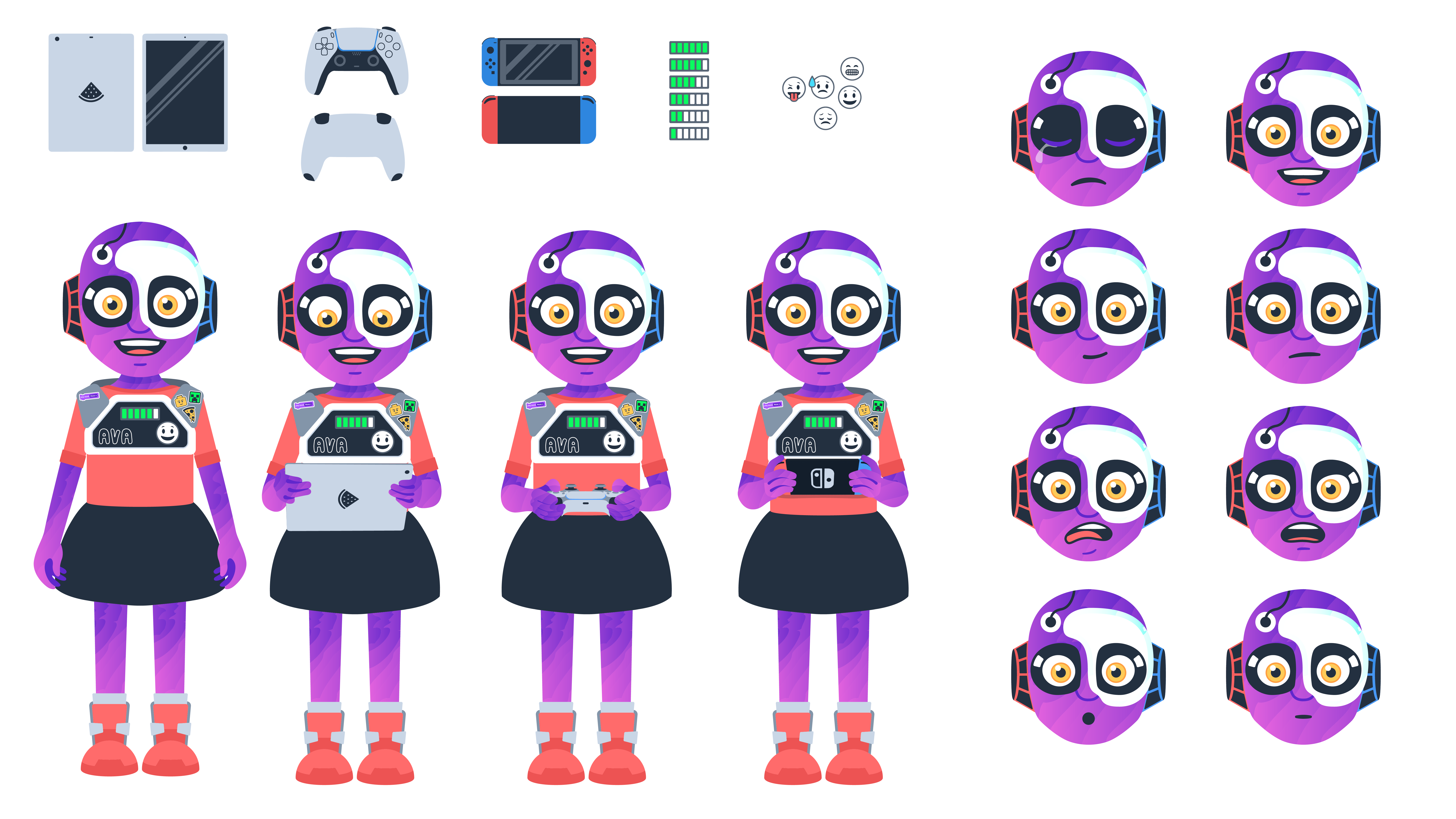 There are three main characters Ava, Noah and Zoe, who each have their own personality and like interacting with different online devices, games and activities. Each character needed to be fairly gender and culturally neutral and clearly show their hobbies and likes. They also had to be easily converted into augmented reality masks for the team at Inform and Empower to act out scenes as the characters for their videos.