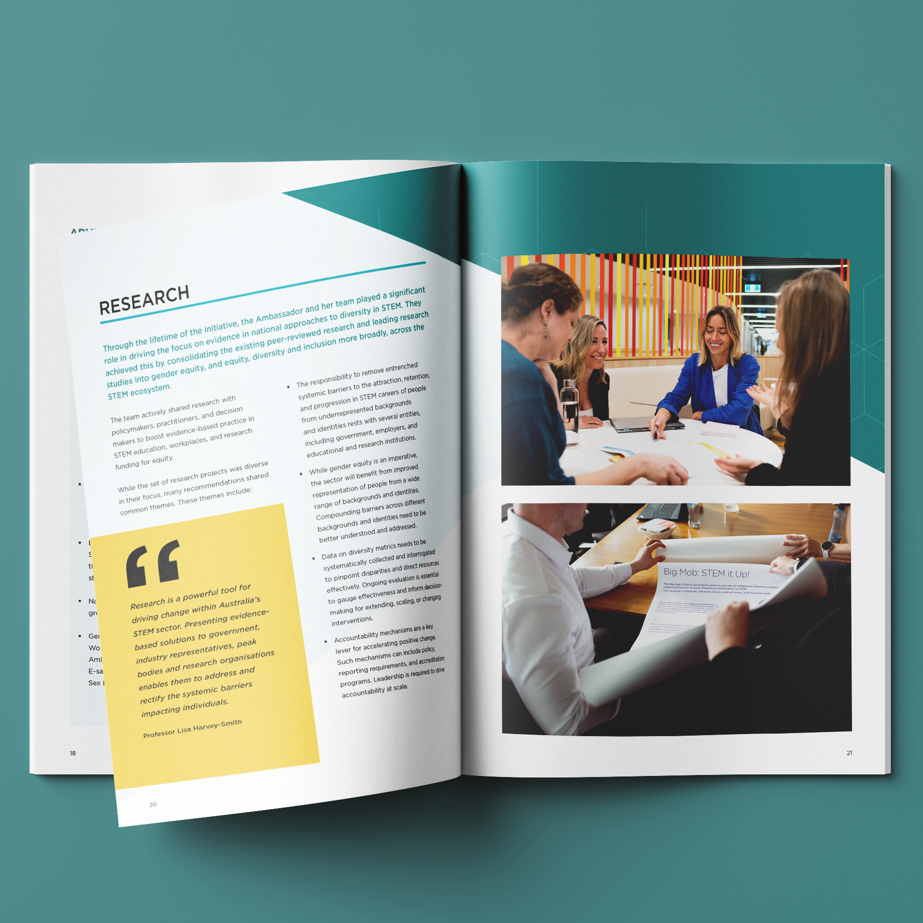 The report features a bold cover and a thoughtfully organised 40-page layout, incorporating typesetting and design that enhance readability. Information graphics were included to effectively communicate data and milestones. The document’s purpose is to summarise the significant work WISA has done to encourage a more inclusive, dynamic, and sustainable STEM sector in Australia.