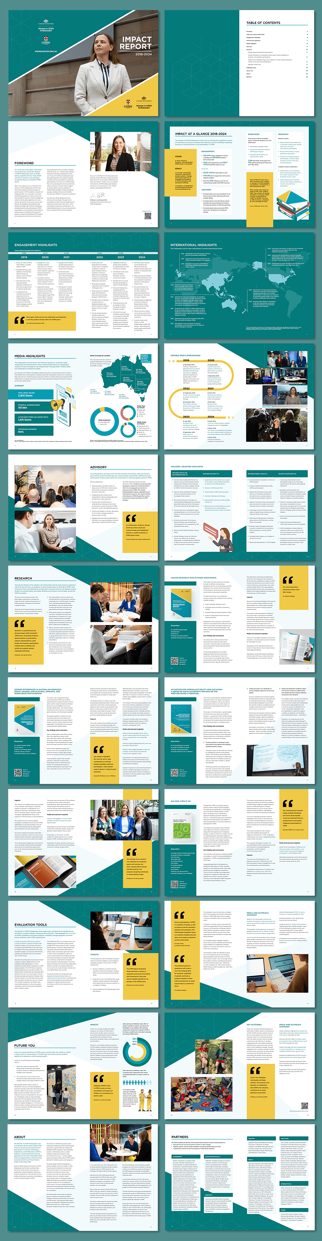 The report features a bold cover and a thoughtfully organised 40-page layout, incorporating typesetting and design that enhance readability. Information graphics were included to effectively communicate data and milestones. The document’s purpose is to summarise the significant work WISA has done to encourage a more inclusive, dynamic, and sustainable STEM sector in Australia.