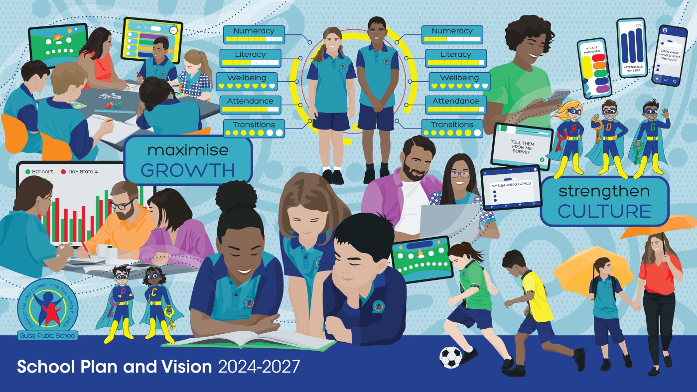 The illustrations highlight the school’s focus on maximizing student growth and achievement, as well as enhancing its learning culture, showcasing practical strategies and initiatives aimed at creating a more robust educational environment.