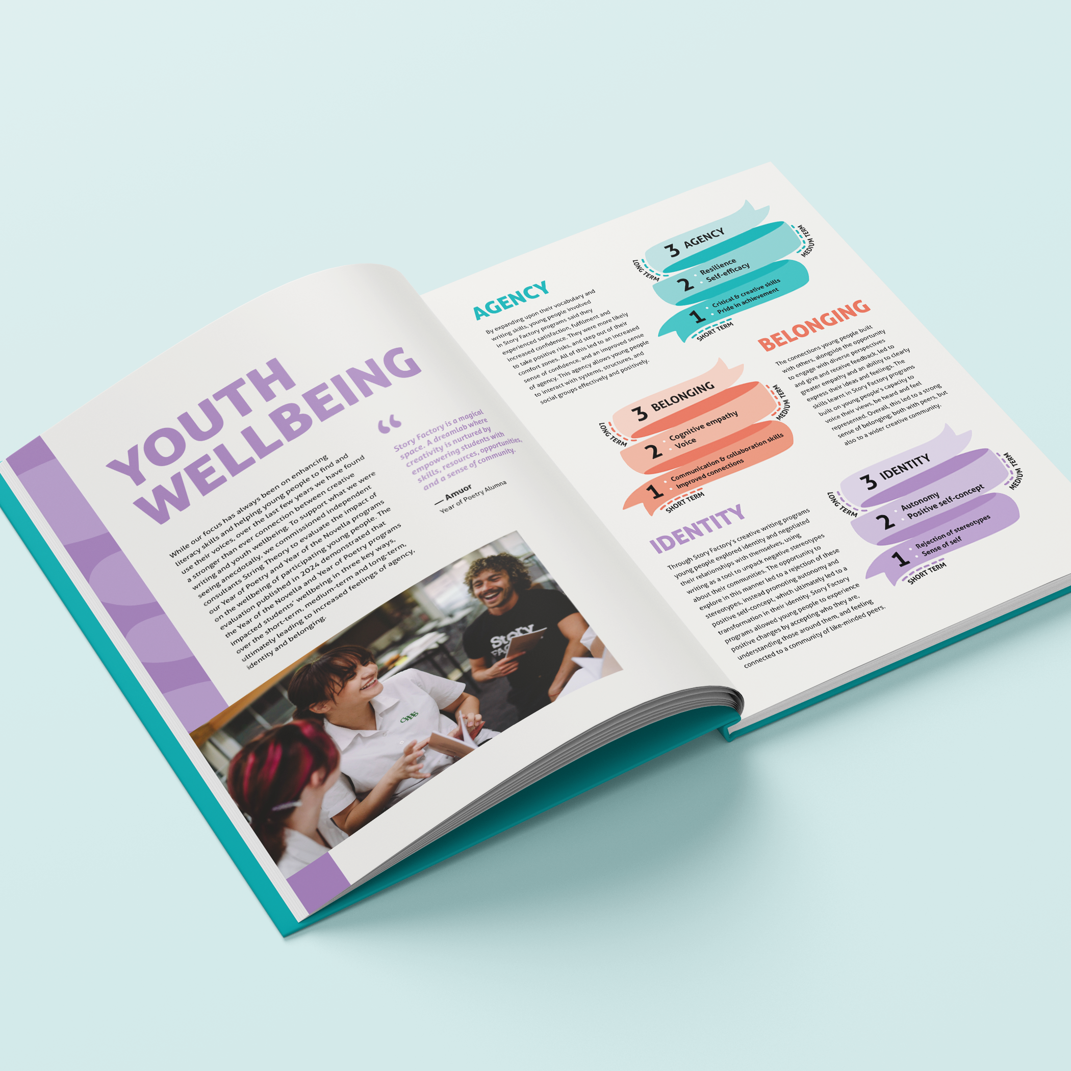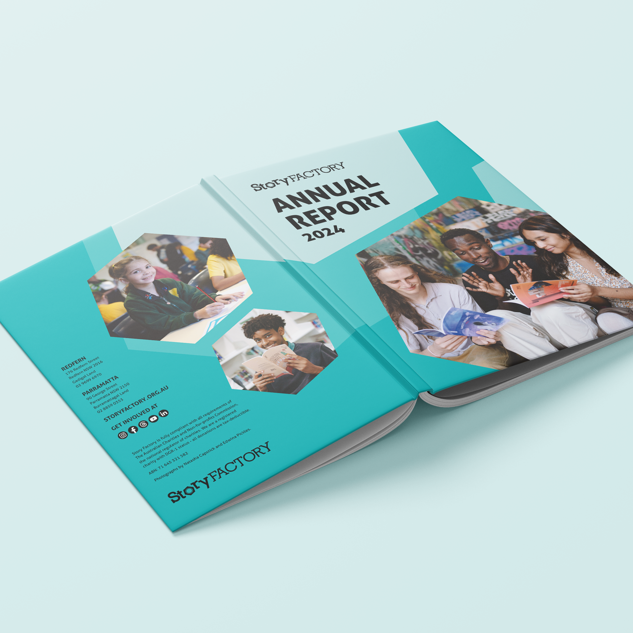 The design uses bold colours and clear typography to bring Story Factory’s work to life, making the report engaging and easy to navigate. The goal was to highlight the organisation’s achievements while keeping the focus on the young writers and their stories.