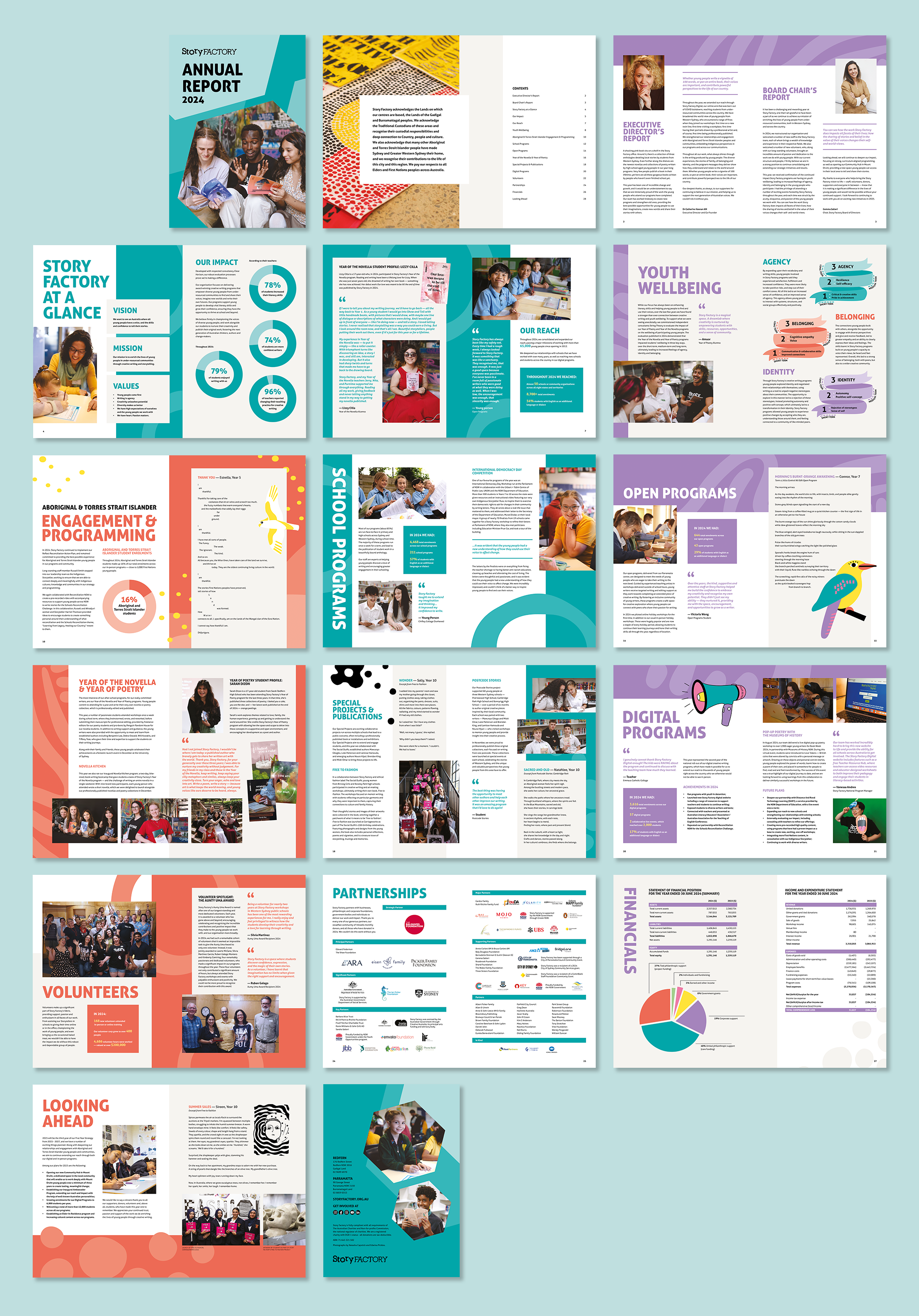 I recently had the opportunity to design the 2024 Story Factory Annual Report, creating a clean and colourful layout that reflects the organisation’s purpose—building writing skills, confidence, and creativity in young Australians.