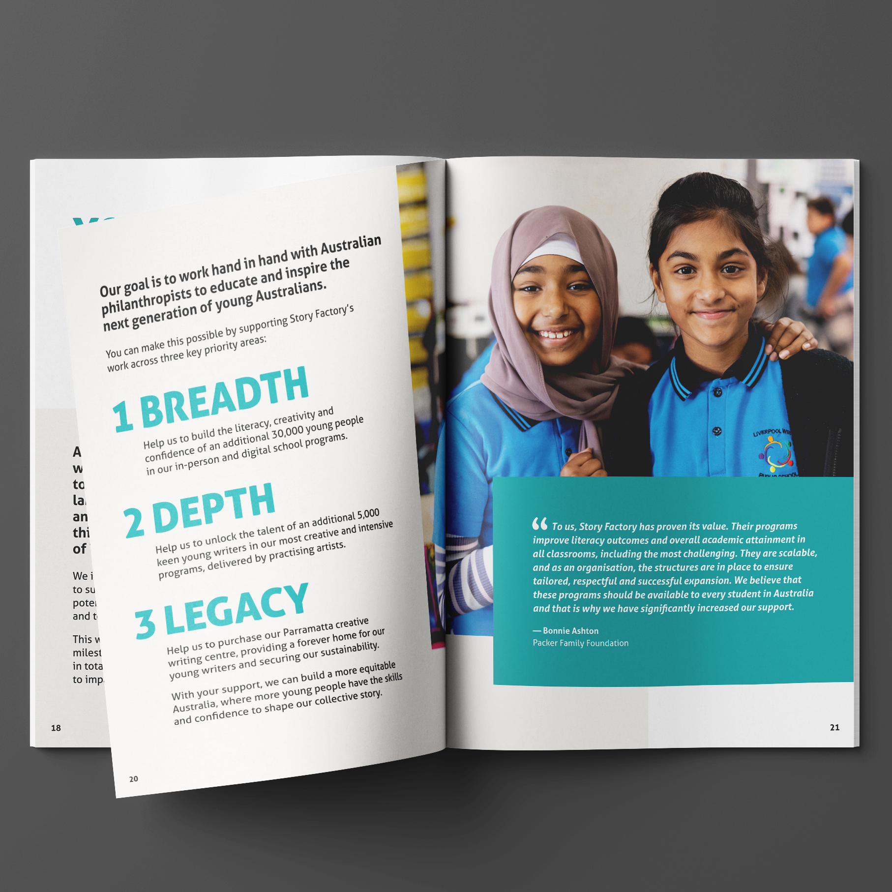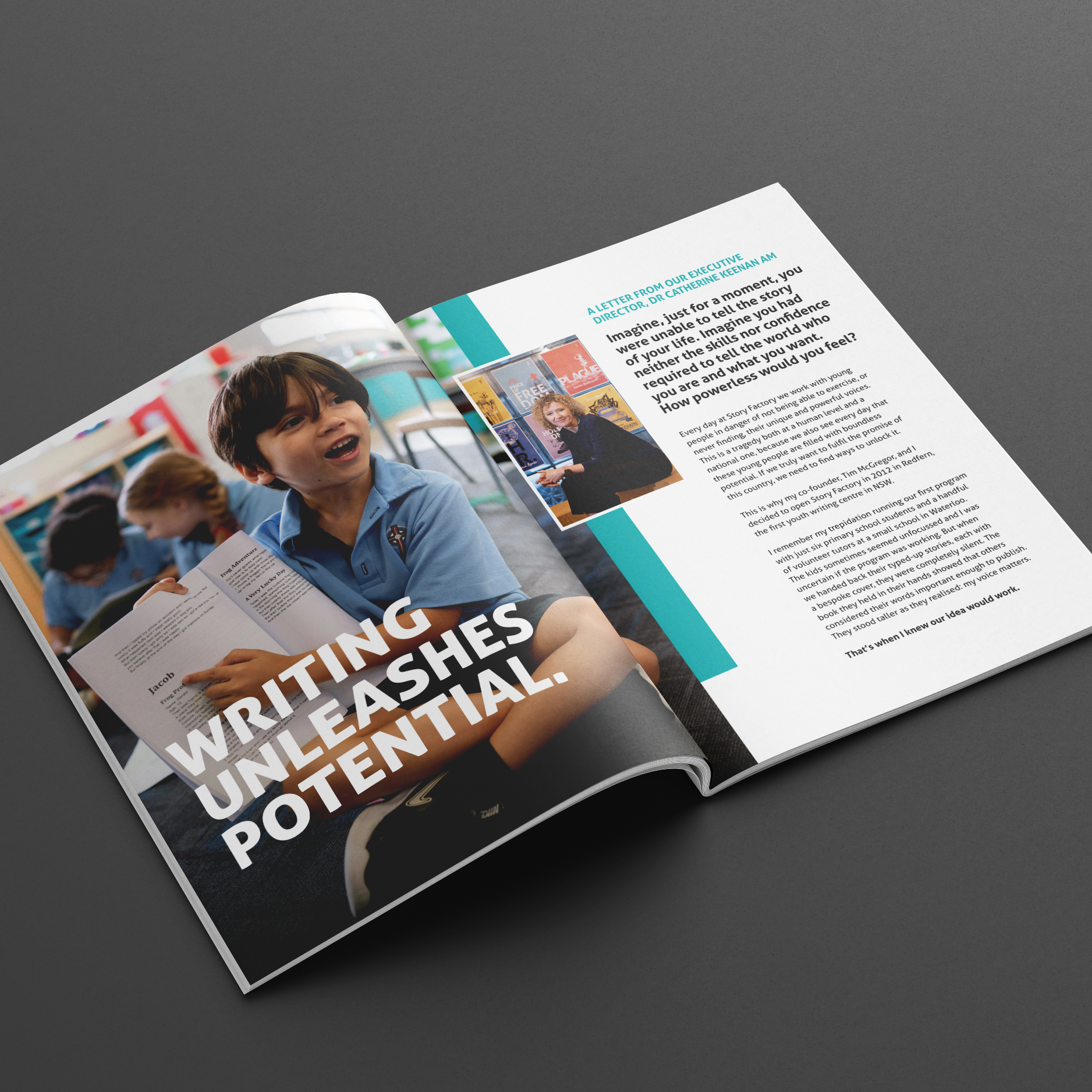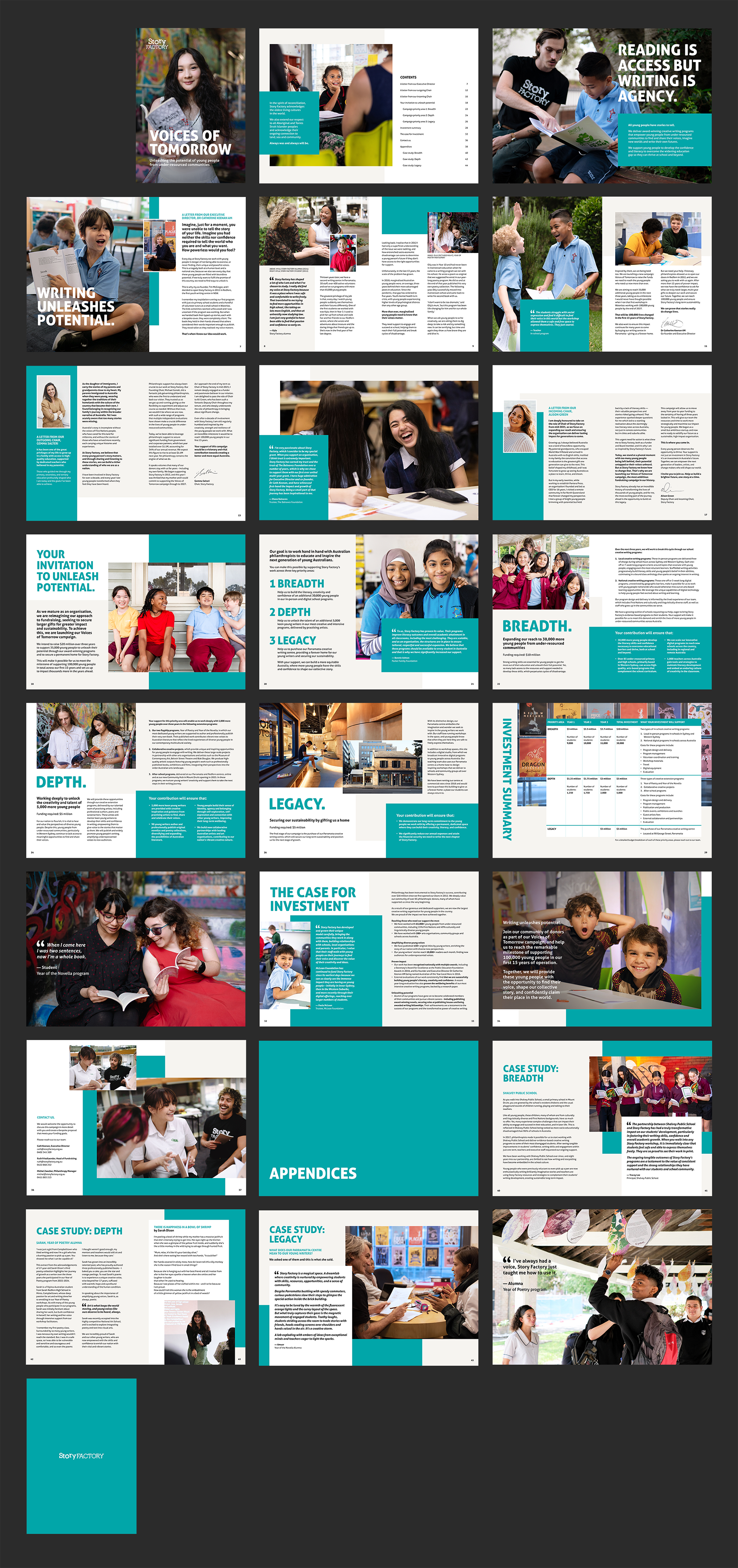 The layout features a clean aesthetic, enhanced by bold typography and a carefully selected palette that resonates with Story Factory’s mission. Photos of the young writers take centre stage, underscoring the impact of Story Factory’s programs through compelling visuals.