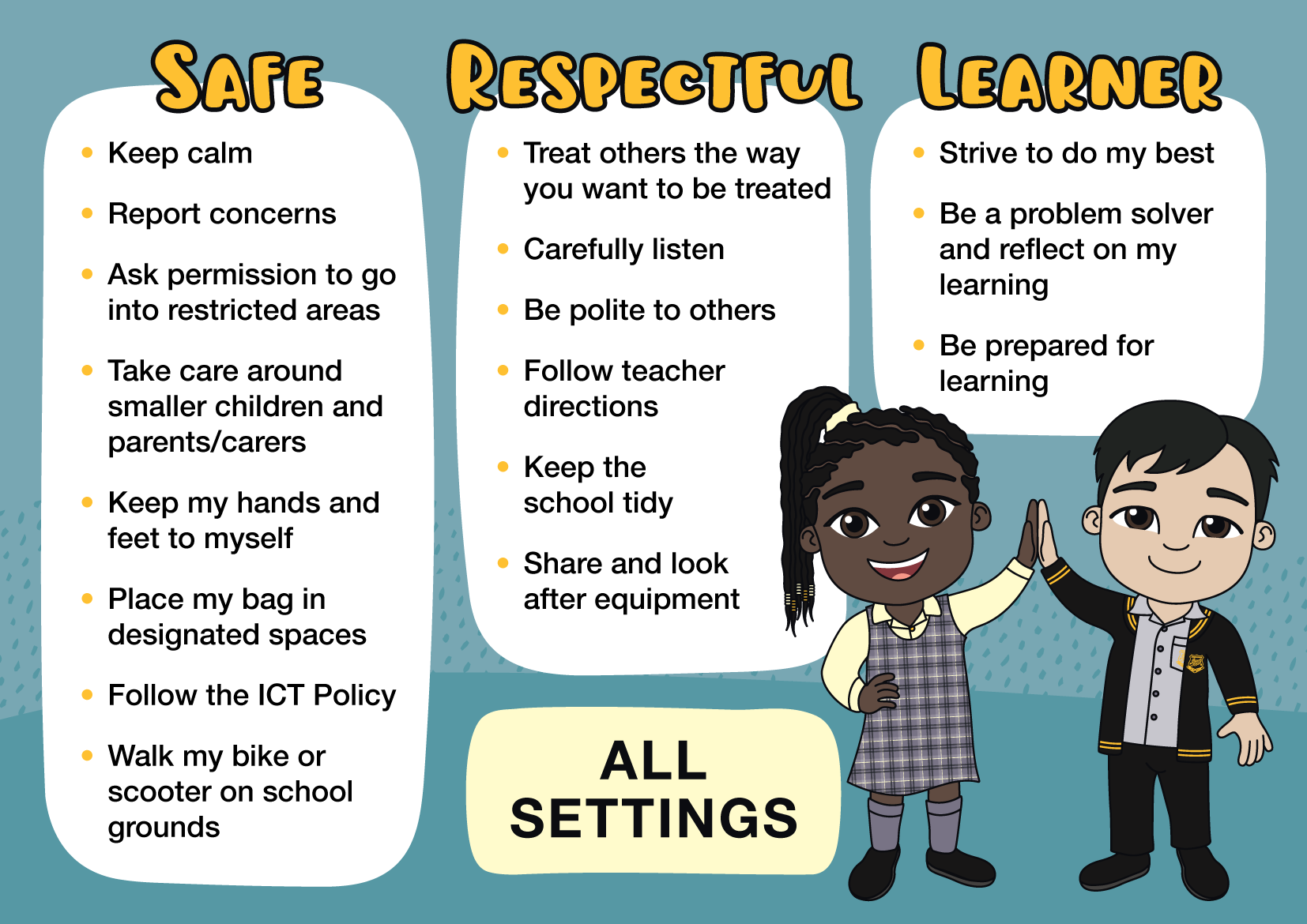 The set includes 11 custom student poses, which were used to create a series of Positive Behaviour for Learning (PBL) signs now installed around the school. Each sign outlines behaviour expectations for different areas—making it clear, consistent and easy for students to understand what’s expected.
