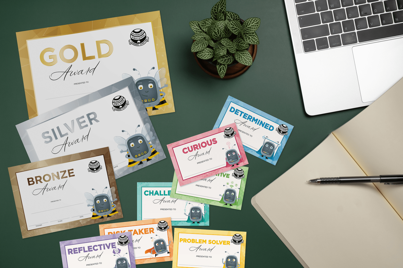 The set includes awards in varying sizes—from mini business card–sized awards for early recognition, through to A5 Bronze and ‘This Week’s Best Work’ awards, a B5 Silver award, and an A4 Gold award. Each award features the WhyFi learner quality character I previously illustrated for the school, helping to create a consistent and engaging visual link across their behaviour and learning recognition systems. The designs aim to celebrate student success in a fun and motivating way at every level.