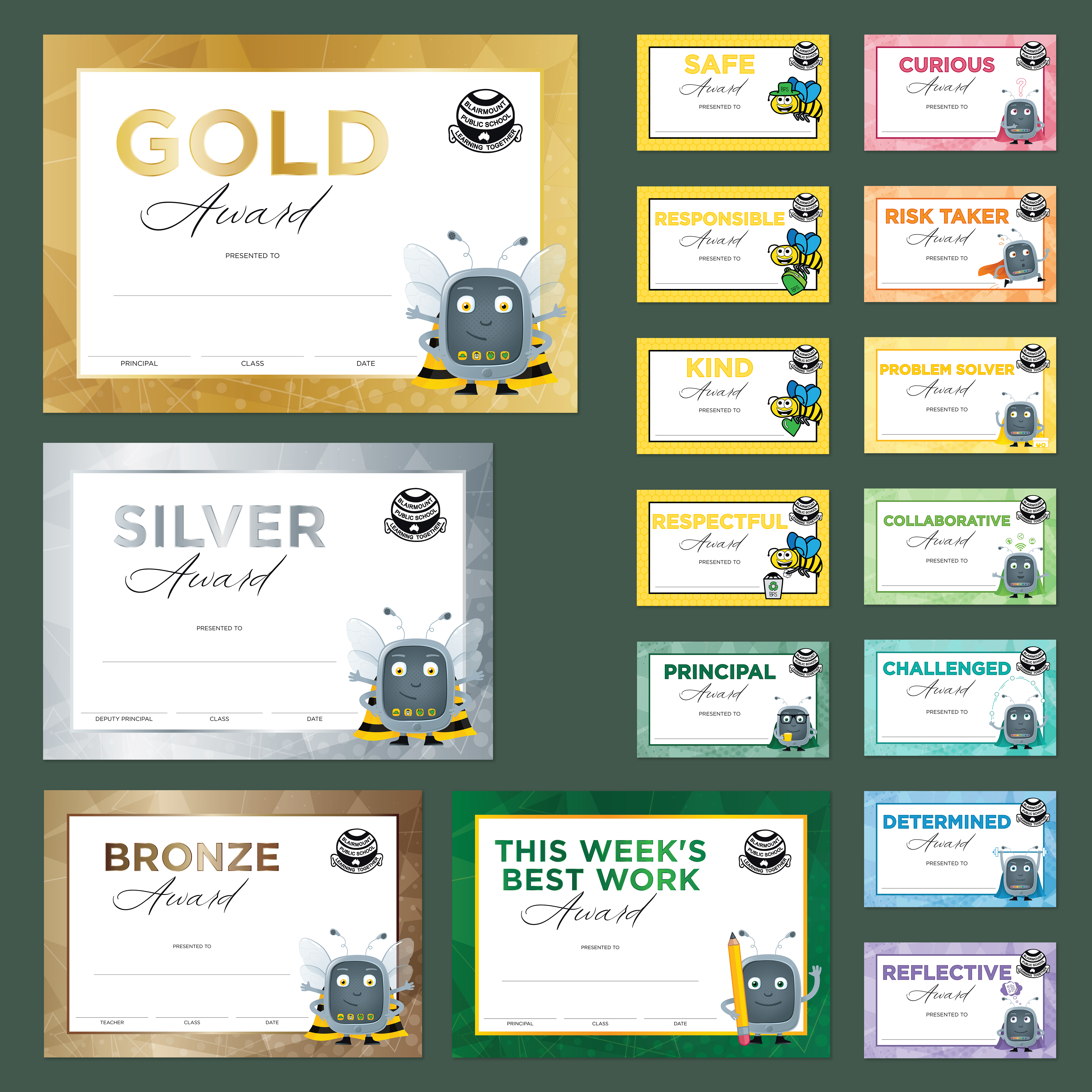 I designed a set of awards for Blairmount Public School, tailored to their student award system where students work their way up from smaller to larger achievements.